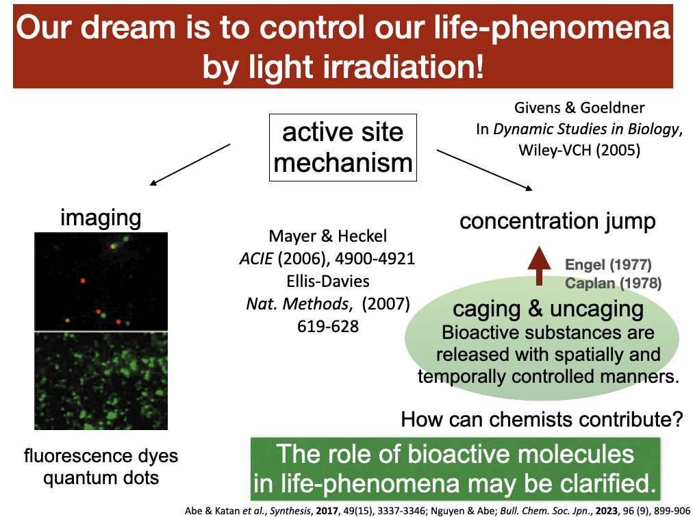In the last two decades, several types of caged glutamates, such as nitrobenzyl-, 7-aminocoumarinyl-, ruthenium-biphenyl-, and carboxymethylnitroindolinyl-caged compounds, have been designed and synthesized for physiological studies. Here are numerous examples (including their reported two-photon uncaging cross-sections,), i.e., N-nitrophenethyloxycarbonyl (Noc-glu), carboxynitrobenzyl (CNB-glu), bromohydroxycoumarin (Bhc-glu, 1 GM/740 nm), methoxynitroindolinyl (MNI-glu, 0.06 GM/740 nm), carboxymethylnitroindolinyl (CDNI-glu, 0.06 GM/720 nm), propylmethoxynitrobiphenyl (PMNB-glu, 0.45 GM/800 nm), ruthenium bipyridine (RuBi, 0.14 GM/800 nm), and bisnitropropylstyrylfluorene (BNSF-glu, 5 GM/800 nm). Recently, we reported the synthesis and photochemical reactivity of caged glutamates with a π-extended coumarin chromophore (HBC-glu) as a photolabile protecting group. We are investigating the design and synthesis of new photolabile protecting groupswith high TPA properties.