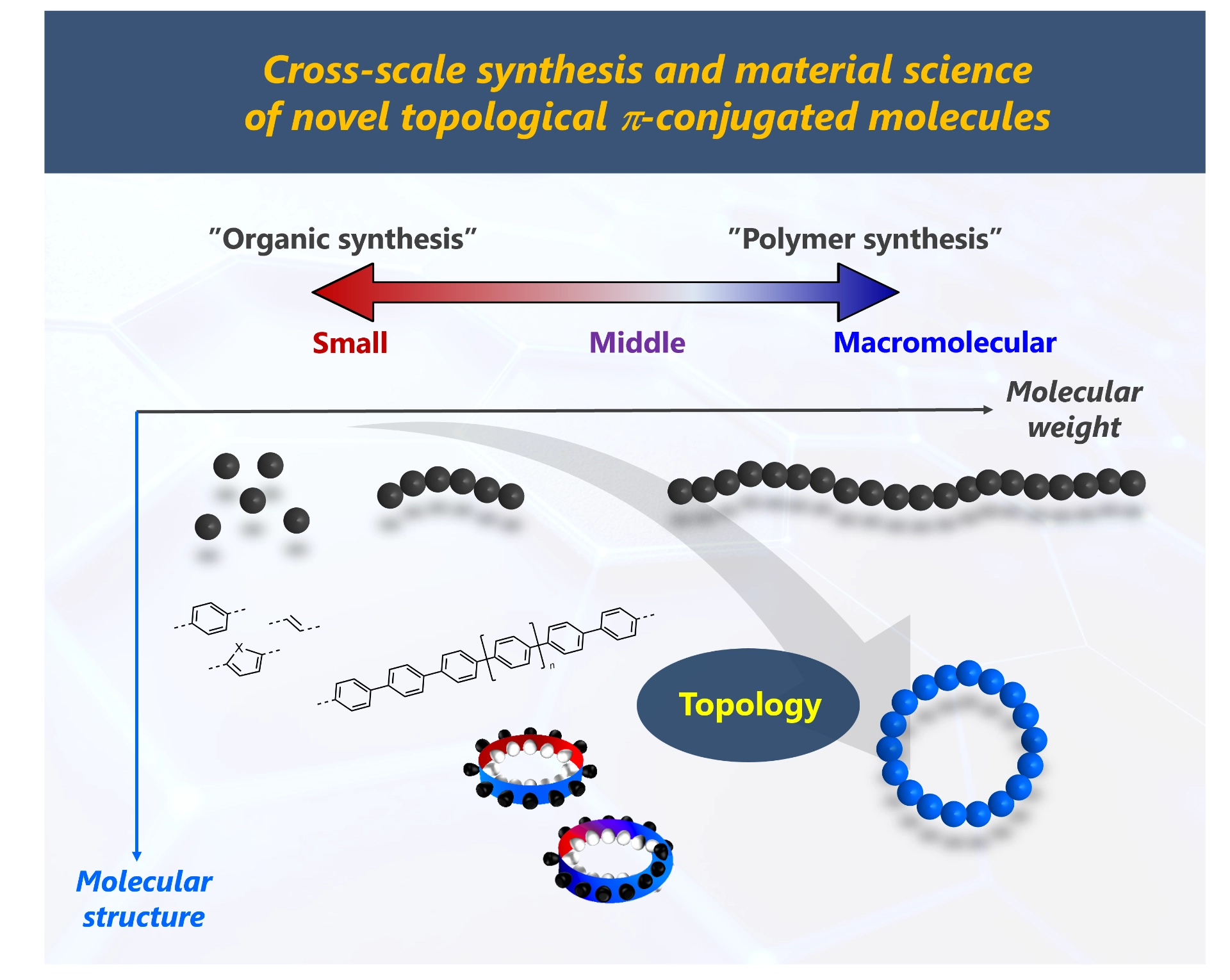 Our group is interested in the design, synthesis, and application of novel π-conjugated molecules, ranging from small molecular to macromolecular. Organic synthesis and polymer synthesis are often studied by different research fields and by different researchers because of the different molecular designs for synthesis and different ways of handling products, but we are tackling cross-scale synthesis targeting novel π-conjugated molecules with the belief that organic and macromolecular syntheses are the same synthetic chemistry. We also focus on developing synthetic methods to access topological π-conjugated molecular and polymer with new topologies because the topology and structure directly affect the physical properties of molecules.